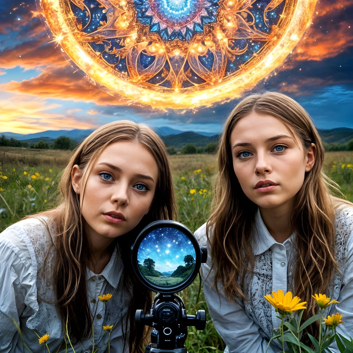 This image shows beautiful girls with blue eyes gazing into kaleidoscopes. The surreal scene is set in a field beneath a starlit night sky, with trees, mountains, and a river in the background.