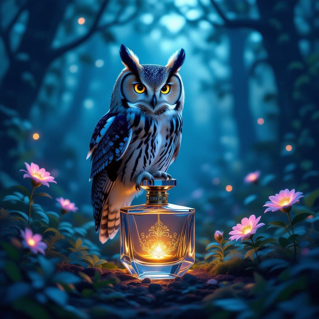 This image shows a solitary owl with iridescent feathers on an art deco perfume bottle in an enchanted twilight forest. Bioluminescent plants create an ethereal glow, in a surreal 3D digital art style with cinematic lighting.
