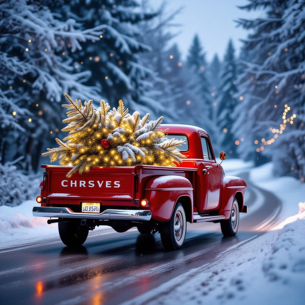 This photorealistic image shows a vintage 1950s red pickup truck carrying a snow-dusted Christmas tree on a quiet, snowy road. Cinematic lighting and a shallow depth of field enhance the festive holiday scene.