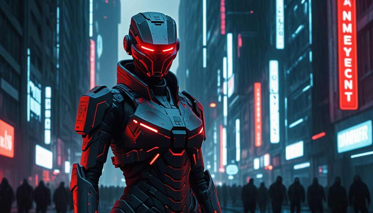 A determined woman in an armored suit stands in a futuristic cyberpunk city with dramatic neon lights. This digital matte painting features intricate details and cinematic atmosphere.