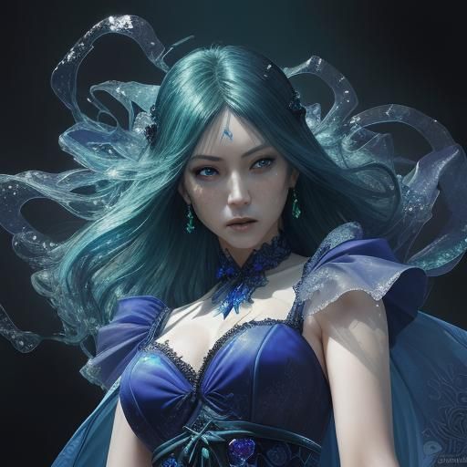 A hyperrealistic concept art image of a Japanese Gothic dress adorned with crystal sapphire and emerald blue details. Features intricate detail, splash art style, and dramatic lighting.