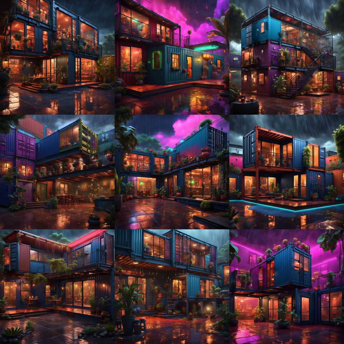 This image shows a two-story Spanish-style house built from shipping containers, featuring a covered patio and neon lighting. The digital artwork has intricate details and complementary colors.