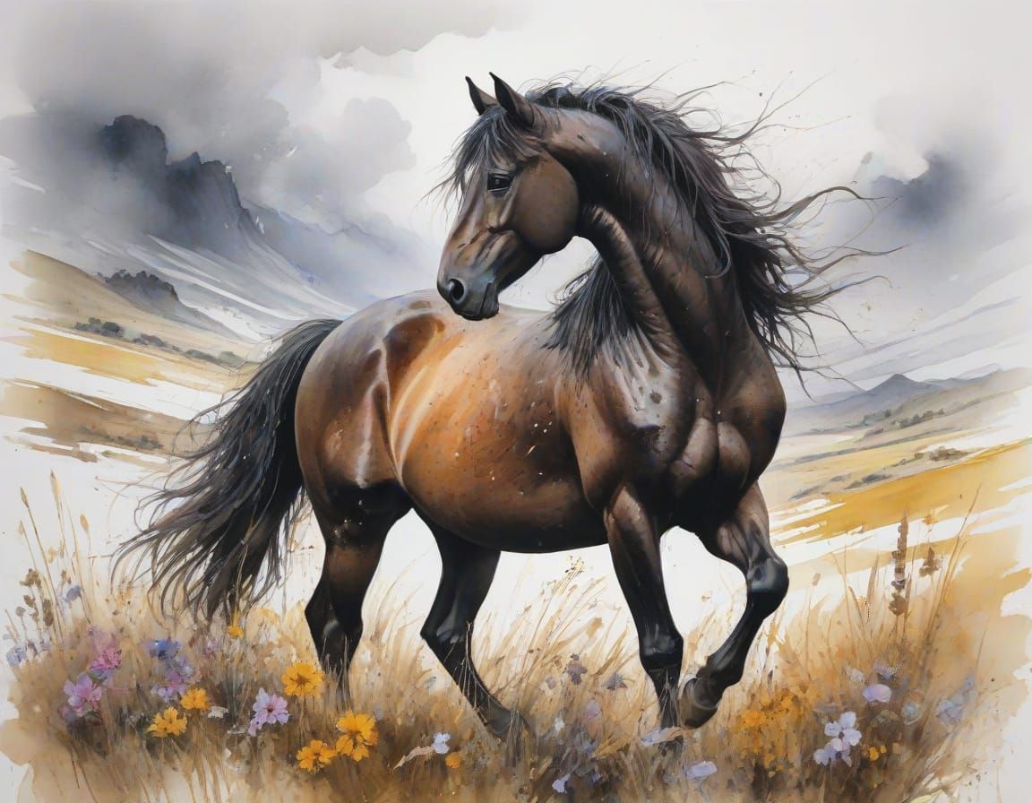 A striking picture of a black stallion grazing in a wildflower field as a storm approaches. The scene is rendered in watercolor with wet-on-wet washes and a warm color palette.