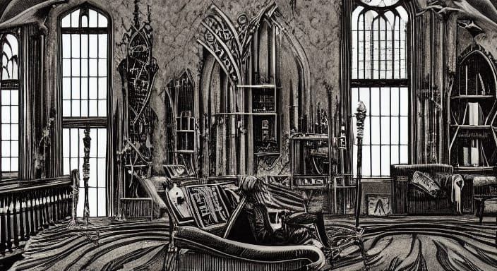 This dark fantasy illustration depicts a mysterious vampire sitting in a luxurious, high-tech attic, surrounded by old furniture and velvet textures, amidst a warm, moody atmosphere with rich colors and cinematic lighting.