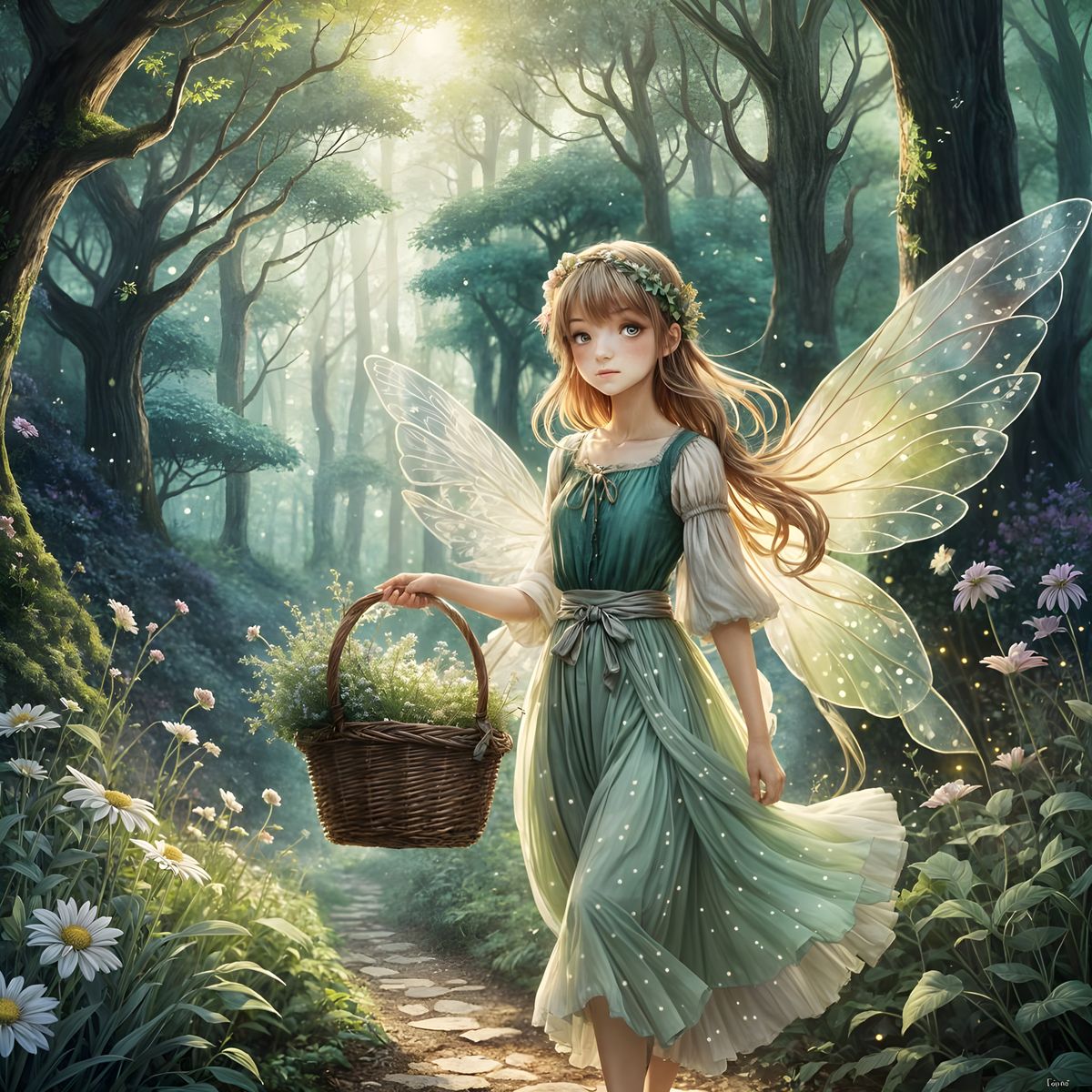 This image showcases a serene forest fairy surrounded by lush greenery, with vibrant flowers in her hand and herbs in her basket. Delicate watercolor textures and soft pastel colors bring a dreamy atmosphere to this anime-inspired artwork.