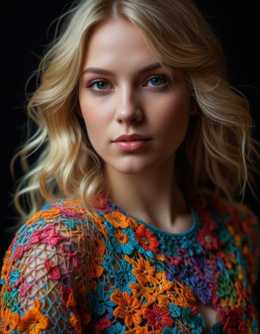 Design unique portraits with AI! Generate your own colorful crochet dress images for free.