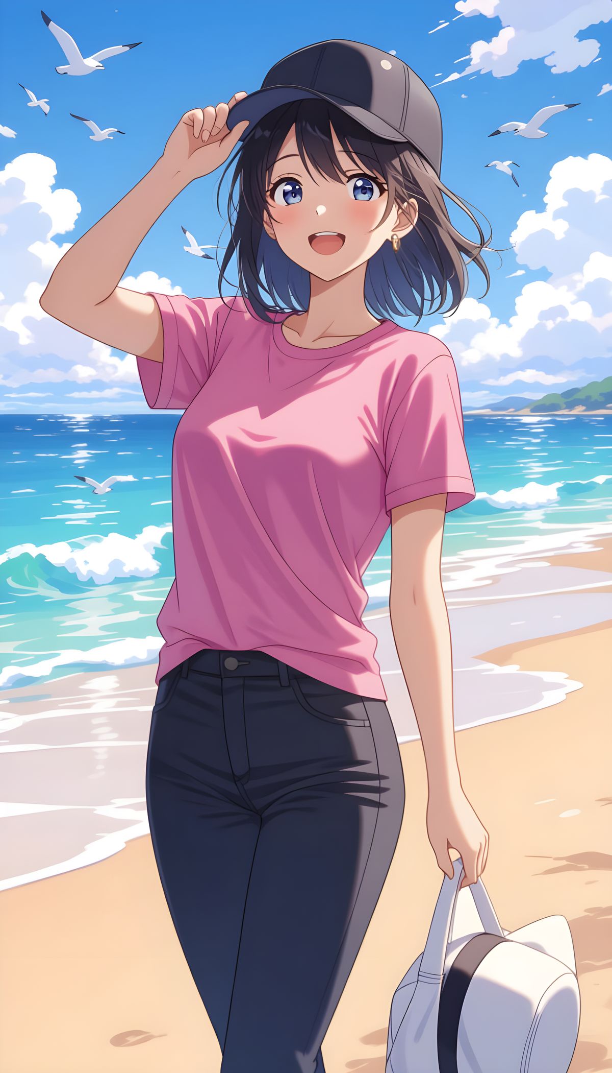 This image features a cheerful anime girl with pink t-shirt, black pants and cap, standing on a rooftop. The digital art rendering is highly detailed and aesthetically pleasing.