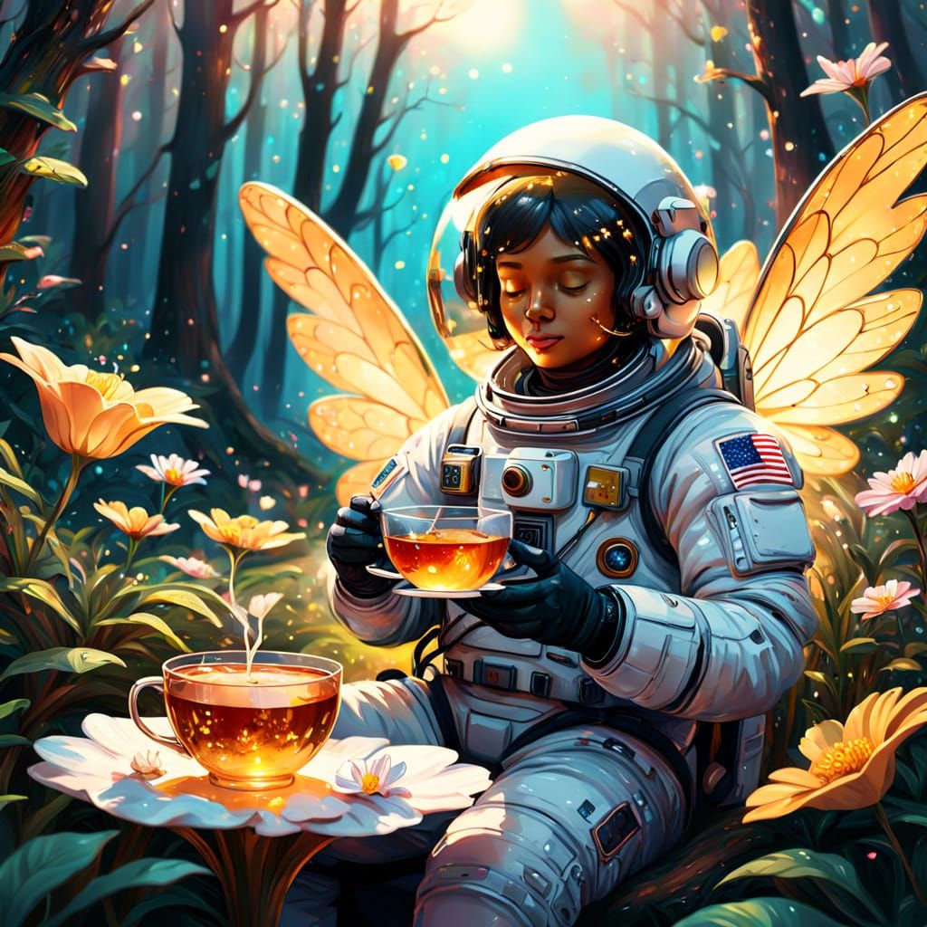 This image shows a serene scene of an astronaut surrounded by lush vegetation on a forest planet, sitting in a flower petal basin and sipping tea amidst a whimsical gathering of fairies and a sunset backdrop.