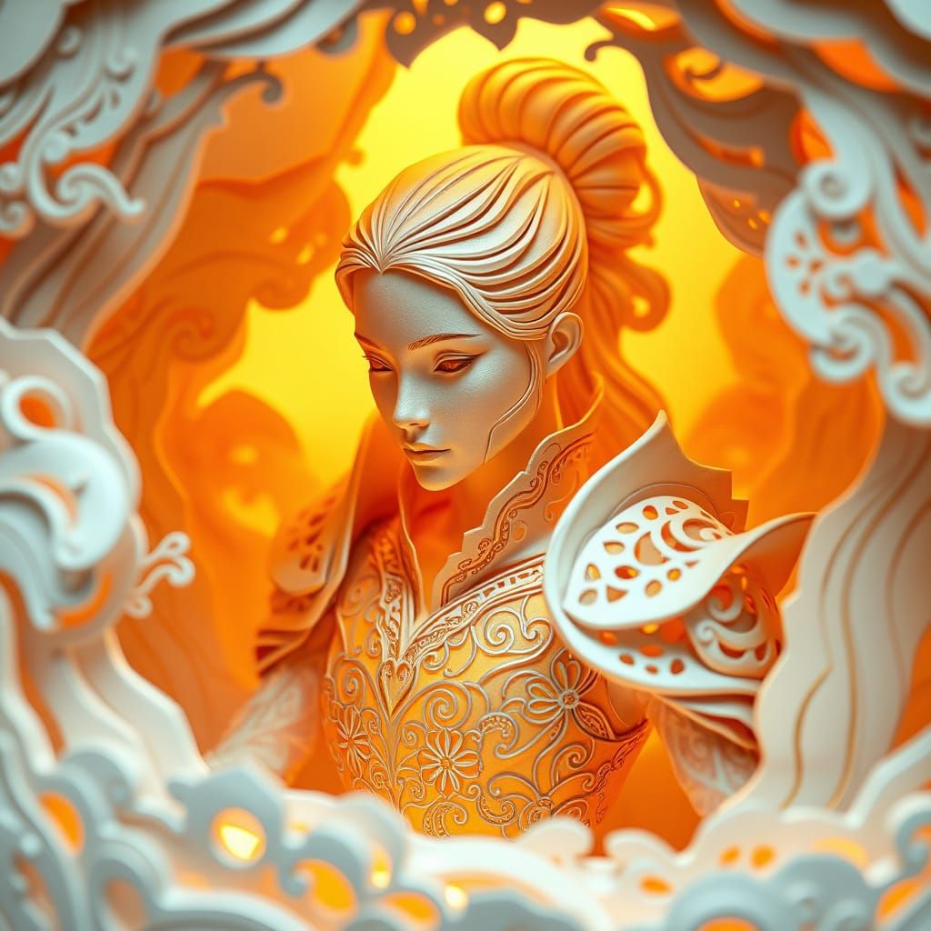 This intricate paper sculpture features a delicate, porcelain-skinned female warrior, encased in a suit of gold-filled, lace-like paper armor, amidst a warm, golden glow emanating from a folded paper world.