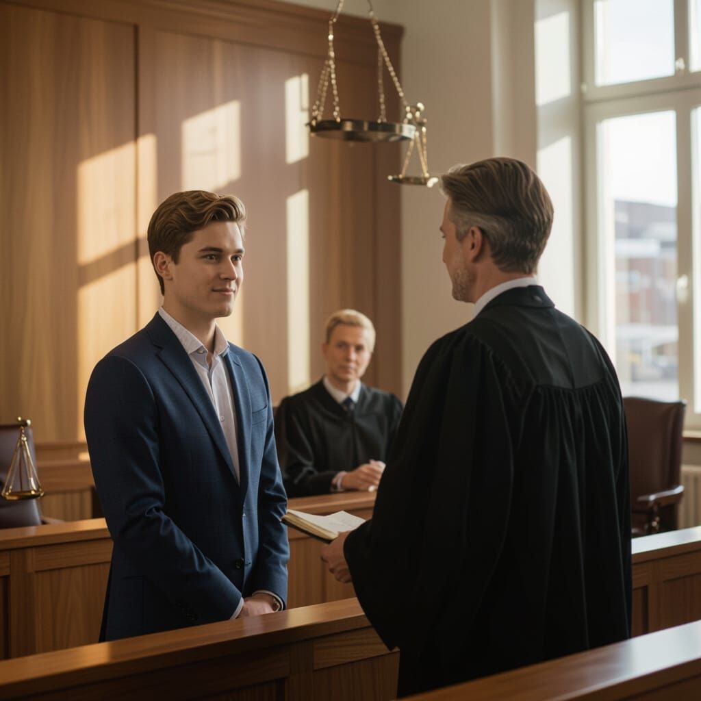 This photorealistic image depicts a calm young man with his lawyer in a Norwegian courtroom. The judge's gentle smile conveys justice and forgiveness, illuminated by soft, diffused light.