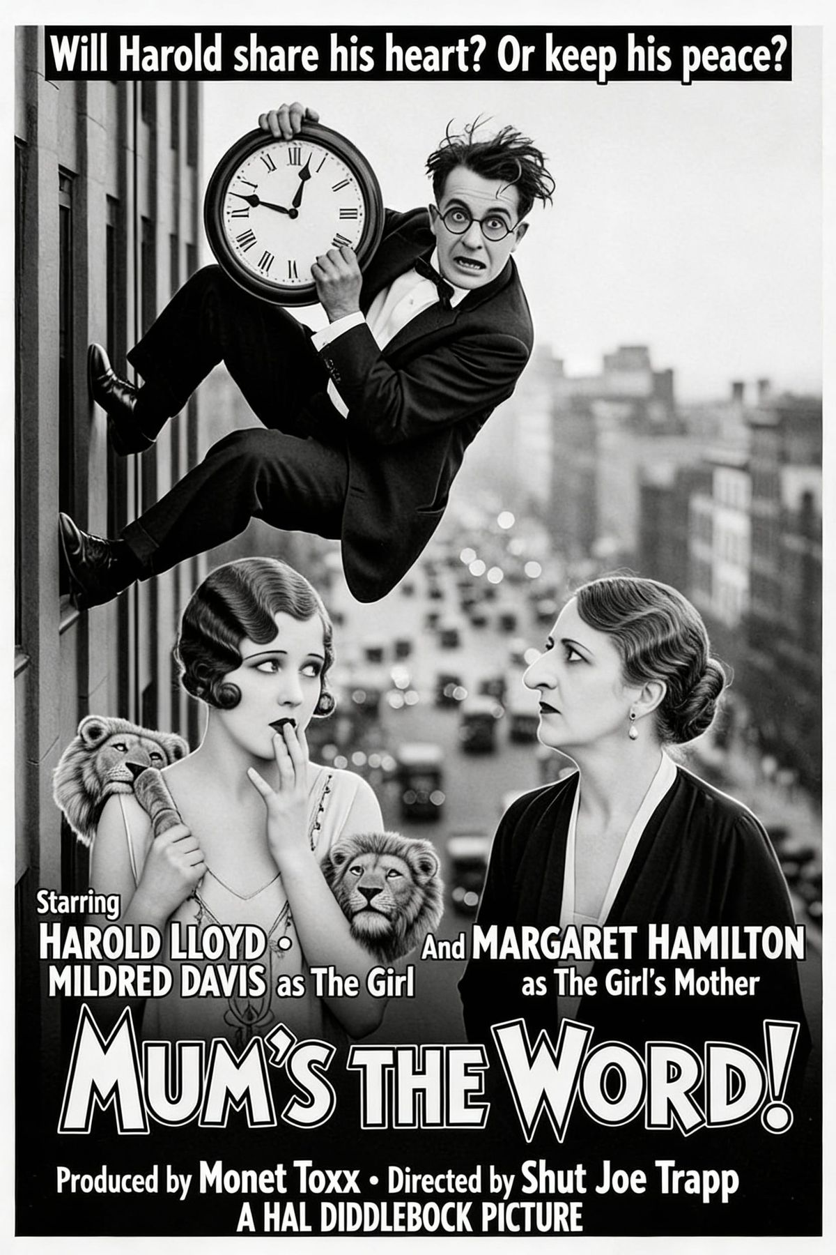 This black and white poster depicts Harold Lloyd in a precarious situation, dangling from a skyscraper clock. It captures a scene of thrilling suspense from a classic silent film.