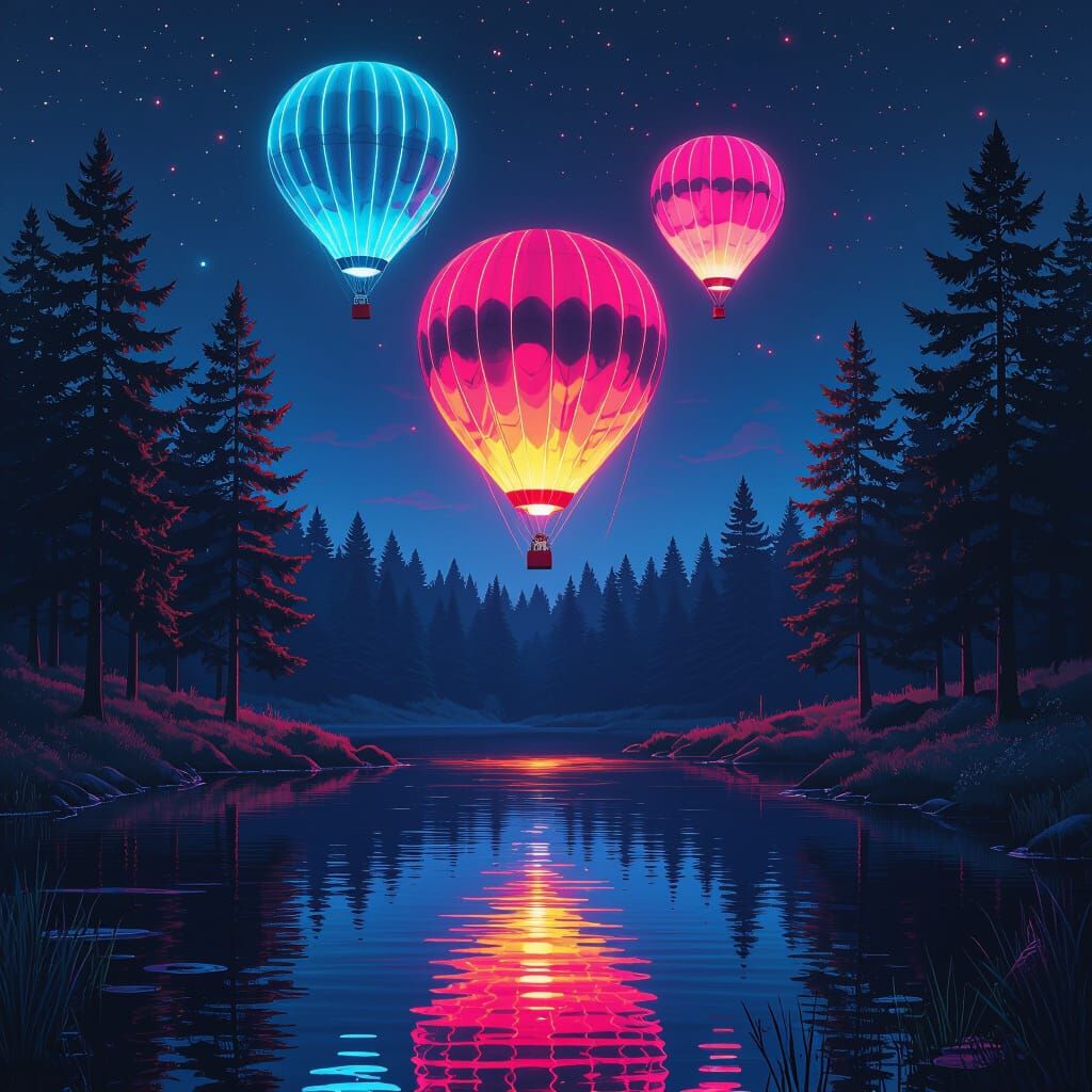 This image shows vibrant neon hot air balloons reflected in a pond surrounded by dark pine trees. The scene is set against a backdrop of total darkness and rendered with neon hues and glowing accents in a futuristic style.