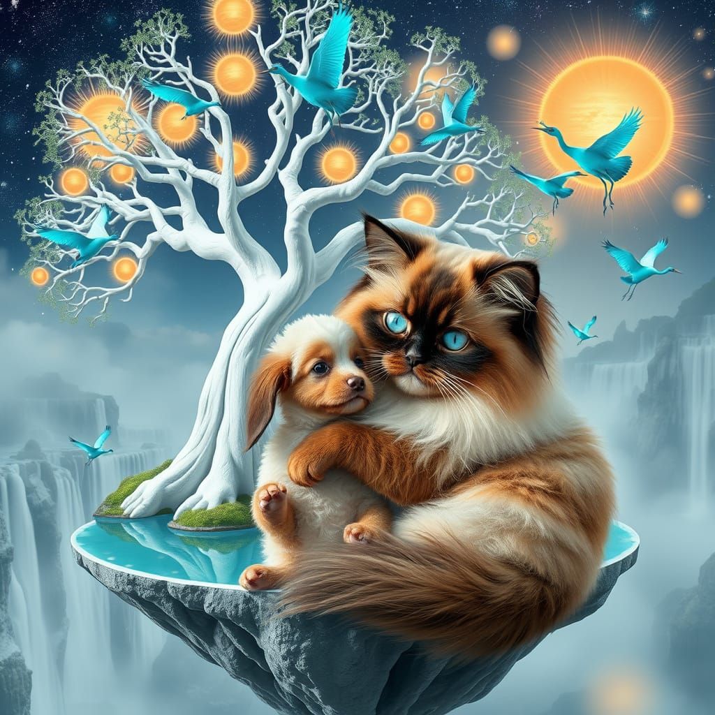 This image shows a colorful Persian cat hugging a dog on a floating waterfall island. Bioluminescent cranes circle above, reflecting turquoise galaxies in crystalline lakes. The scene is bathed in ethereal light.