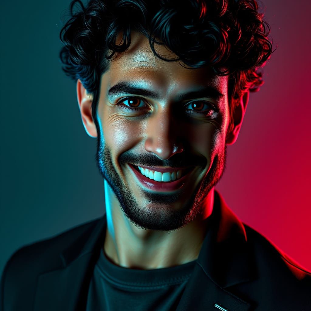 A head and shoulders portrait of a 24-year-old Italian man with dark curly hair and a charismatic smile. Rendered with hyperdetailed, intricate detail and dynamic lighting for a striking effect.
