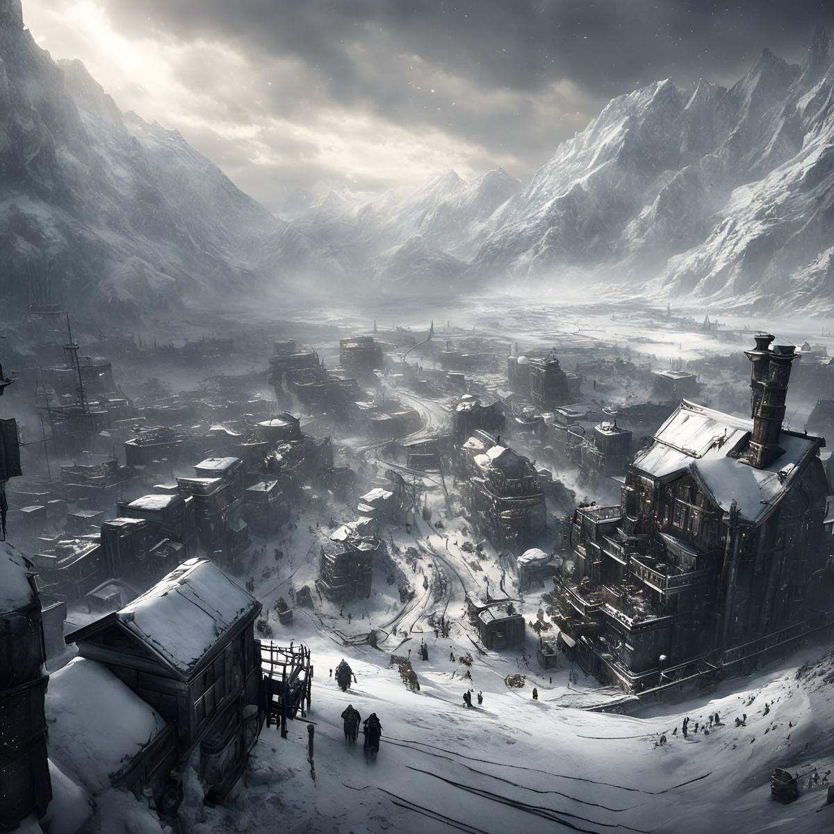 A dramatic digital painting of Frostpunk. This image showcases a meticulously detailed and atmospheric environment, rendered with maximalist elements in a cinematic style.