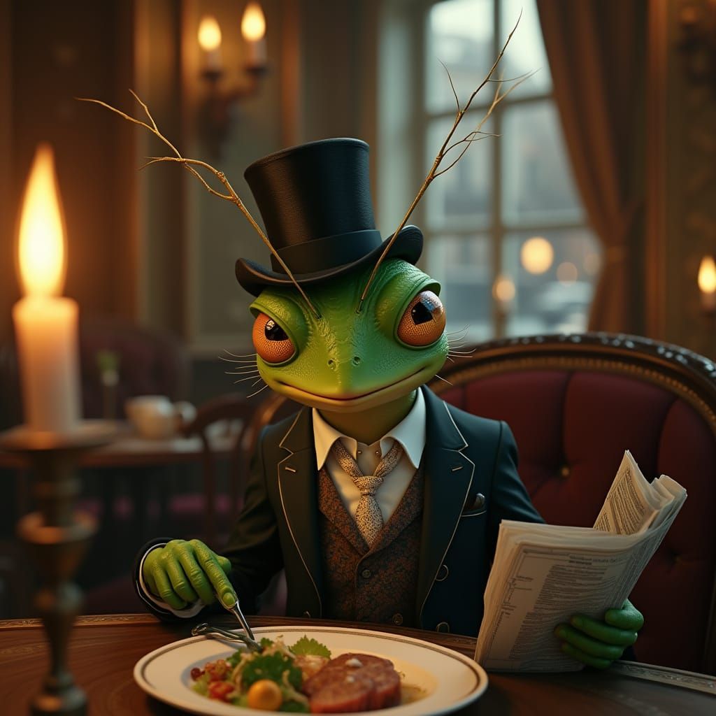 This image depicts a stylish cricket in a three-piece suit, enjoying dinner at a charming Parisian cafe. The interior is a masterful blend of Belle Époque charm and modern elegance, with intricately carved wooden panels and delicate china. The atmosphere is warm and inviting, with the soft glow of candel...