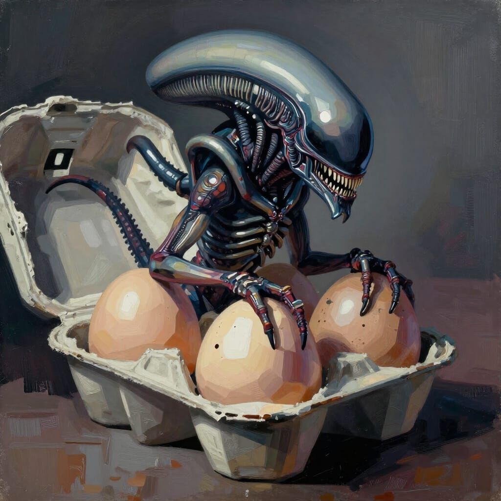 This image shows a Xenomorph emerging from an egg carton, rendered in a low-poly, rough-stroked style with Tenebrism lighting and surrealist influences.