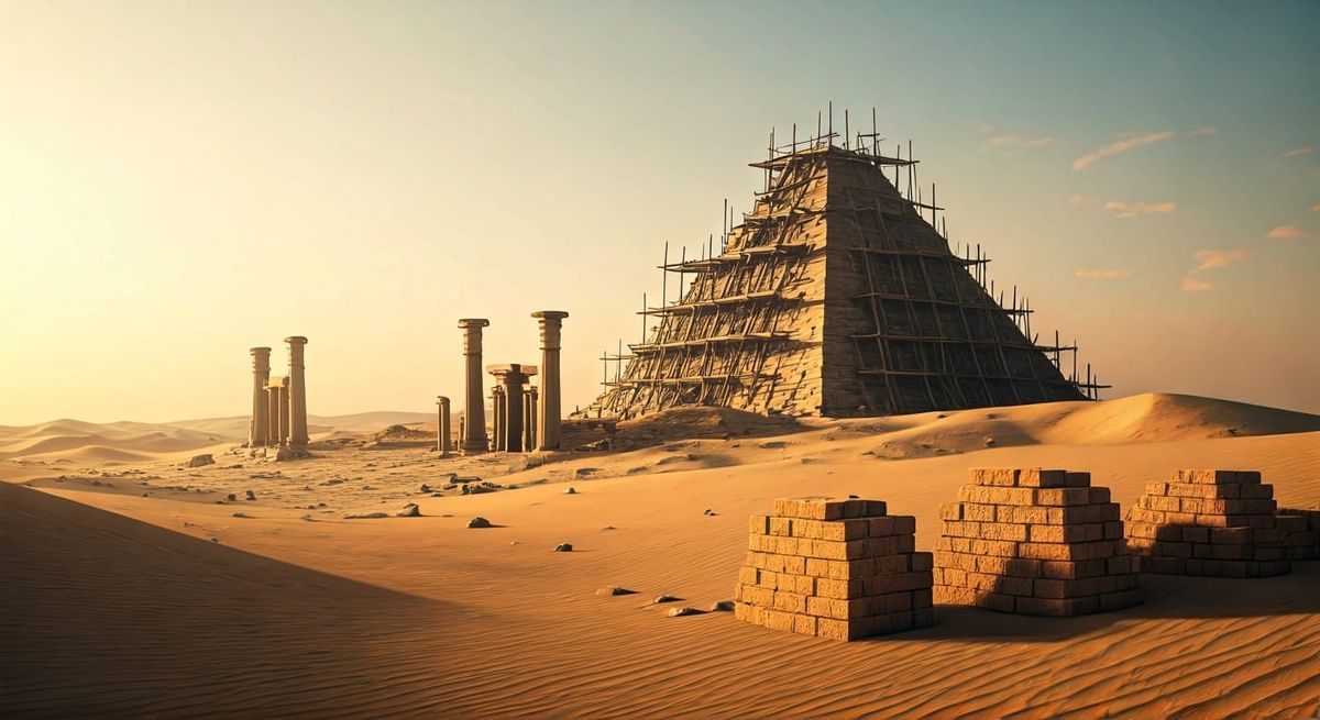 This image shows an expansive desert scene in ancient Egypt at sunrise. A partially constructed pyramid stands in the distance, with scaffolding and mud bricks scattered around, rendered as a matte painting.