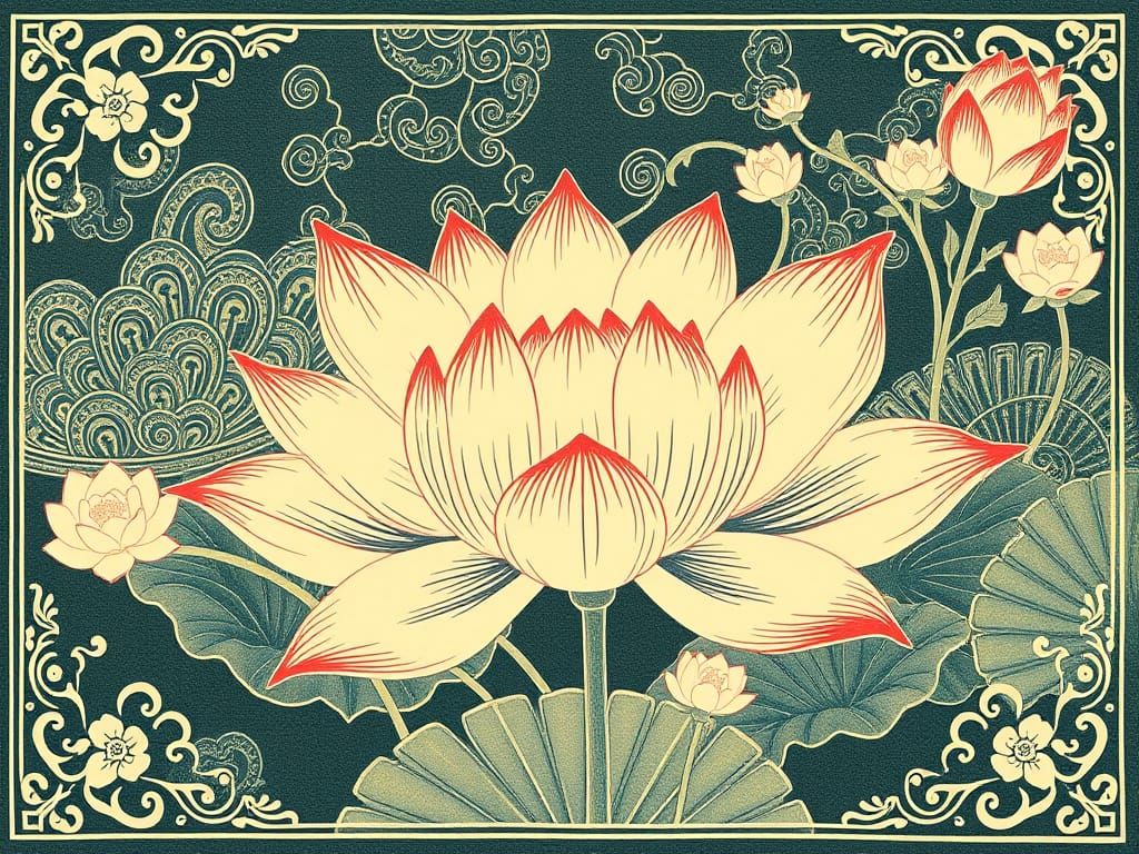 This image features vintage Japanese stencil designs with a lotus motif. The artwork blends traditional patterns with Korean Minhwa folk painting, showcasing delicate linework and ornate flourishes.