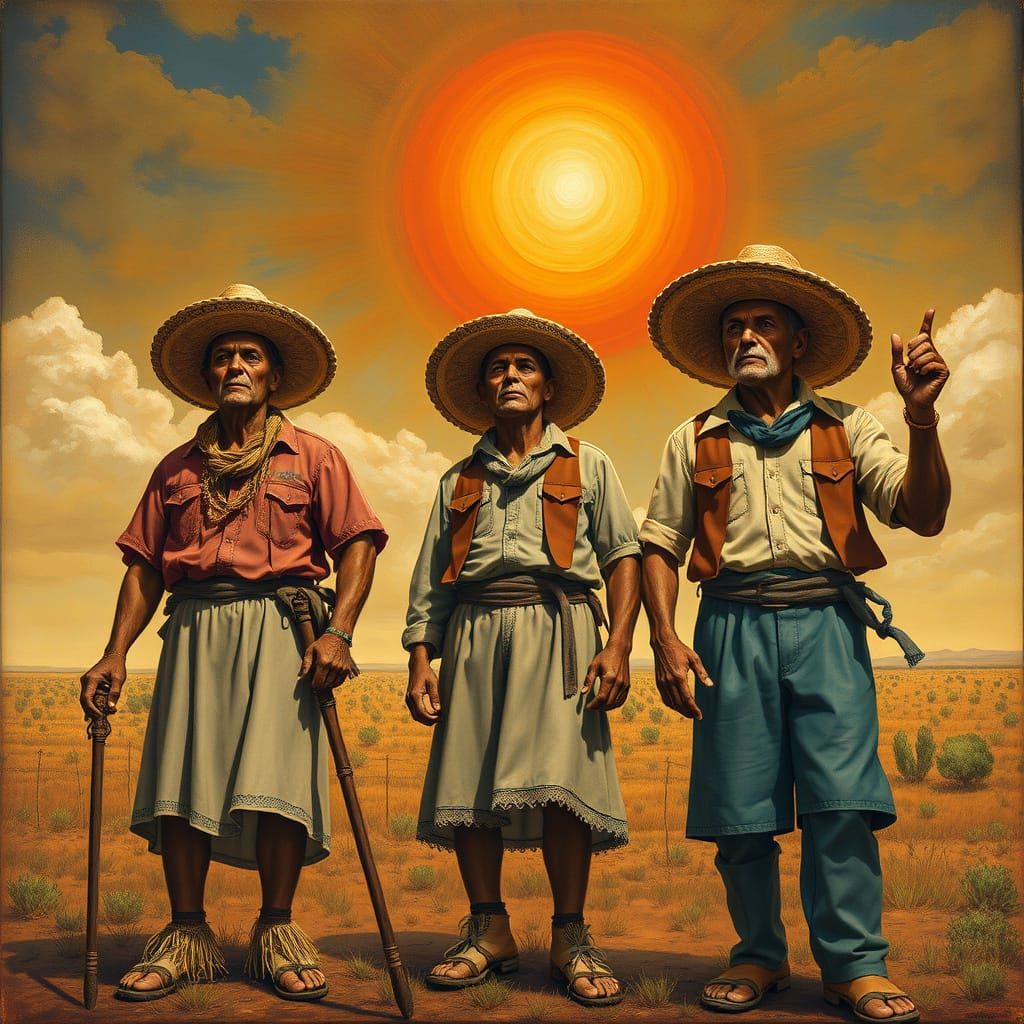 A stark image of three emaciated farmers in a barren, cracked landscape. Evokes a Mexican aesthetic reminiscent of Posada and Rivera, influenced by the Catrina, with magical realism elements under an intense sun.