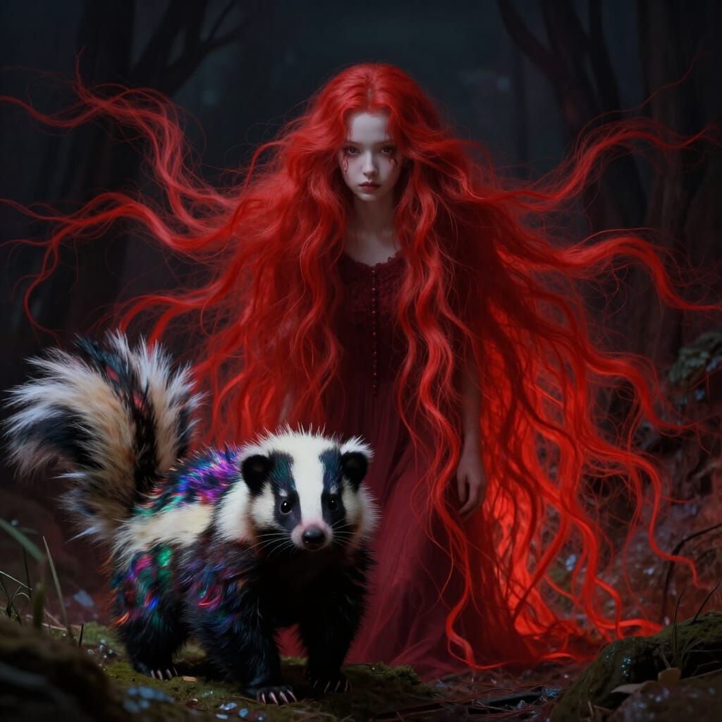 This striking image showcases an ethereal girl with crimson hair and an iridescent skunk in a dreamlike, unsettling landscape. Rendered in a dark fantasy art style with dramatic lighting and vibrant colors.
