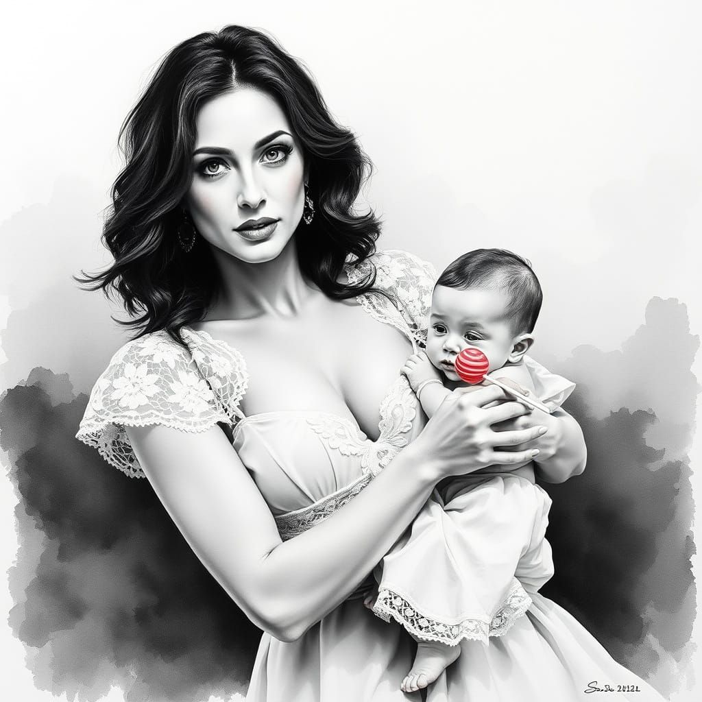 This image shows Monica Bellucci in a lace dress, holding a baby and a lollipop. Rendered in a gouache style, the artwork features thick brushstrokes and textured layers on canvas.
