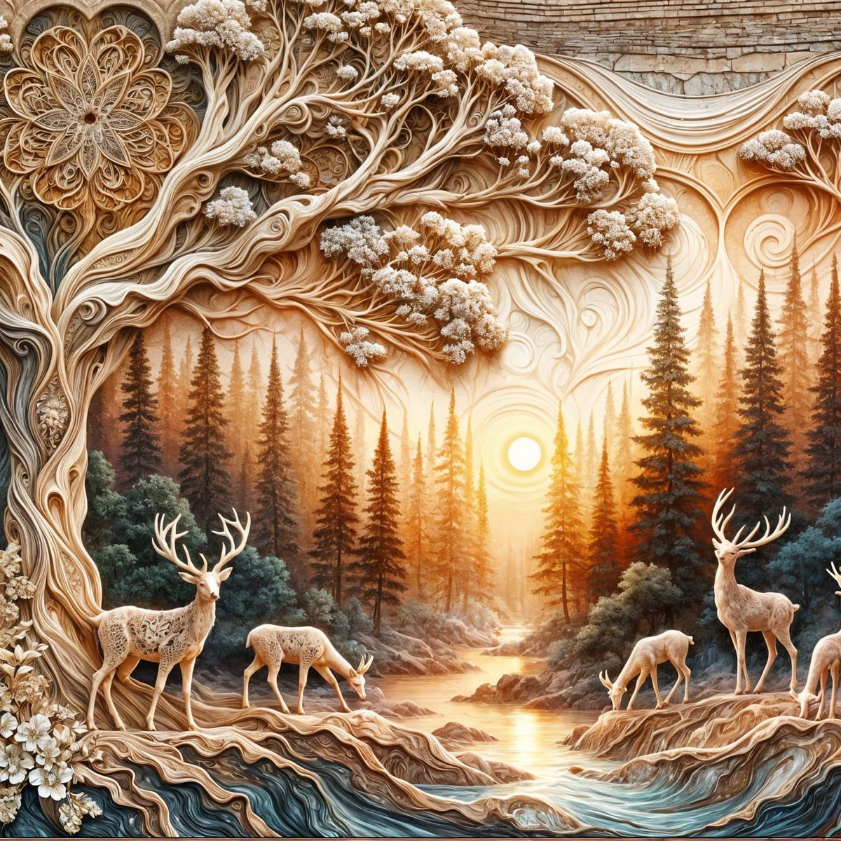 A striking picture of a sunset in a beautiful forest. Deer graze peacefully in the foreground of this mixed-media collage, featuring golden filigree, soap sculptures, alcohol ink and wood carving.