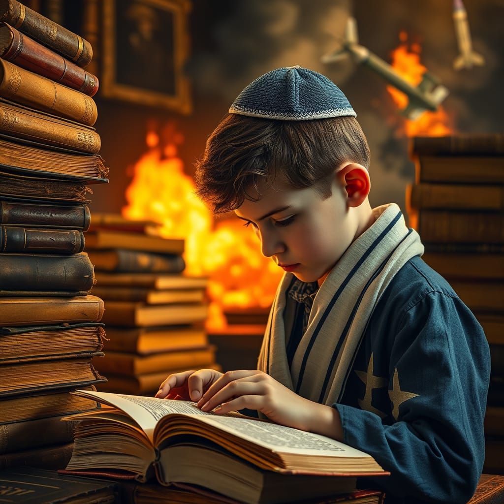 This image shows a young boy studying sacred texts. He is surrounded by books in a room illuminated with warm light and bold colors, contrasted by a blurred, dystopian background.