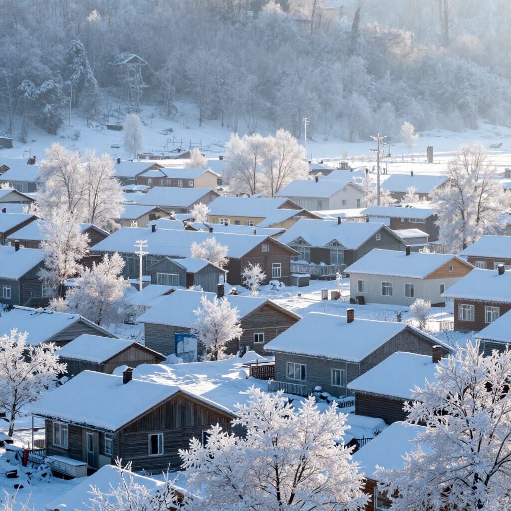 This image depicts a picturesque village covered in fresh snow, illuminated by the gentle glow of morning light. It captures a serene winter scene.
