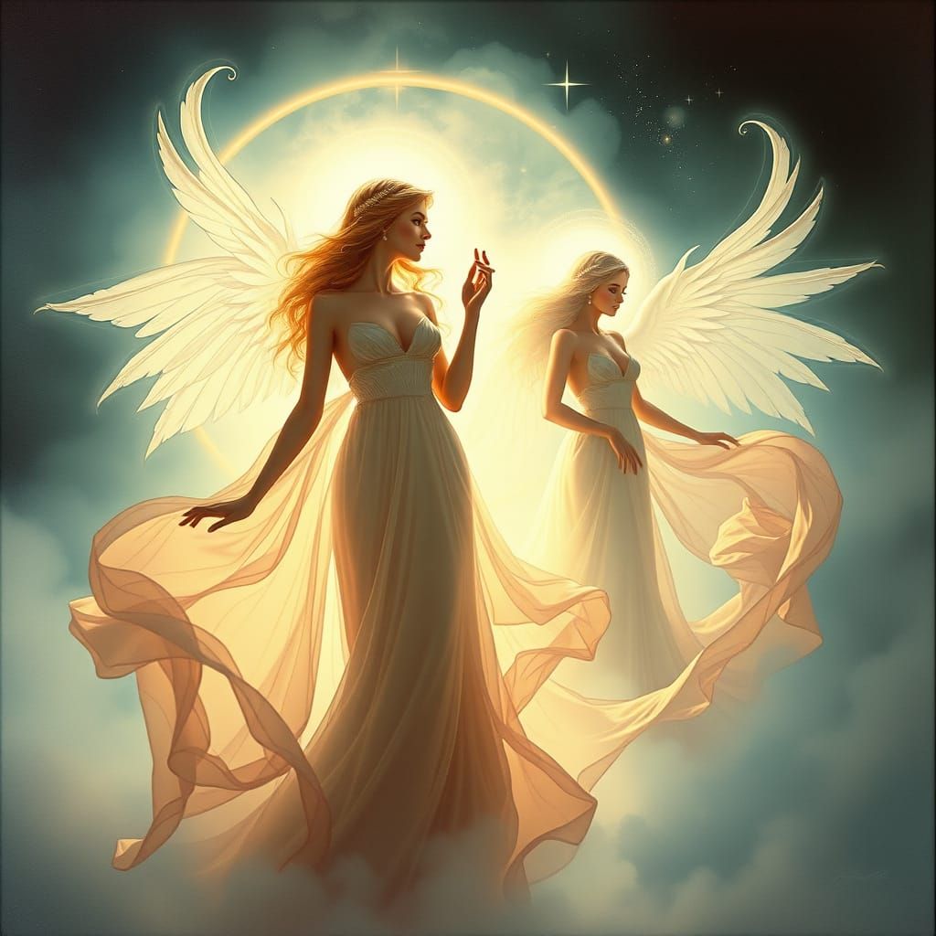 This image shows ethereal women in flowing gowns bathed in a heavenly glow. The artwork features cinematic lighting and vintage film grain, with a blend of art nouveau and neo-futurist aesthetics.