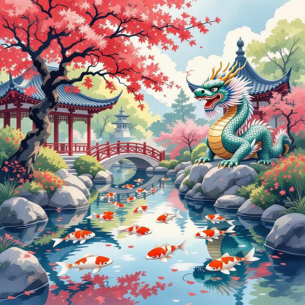 A serene Japanese garden featuring koi fish in a pond, a Chinese garden with a dragon statue, and a red cherry blossom tree. Rendered with soft watercolor textures.