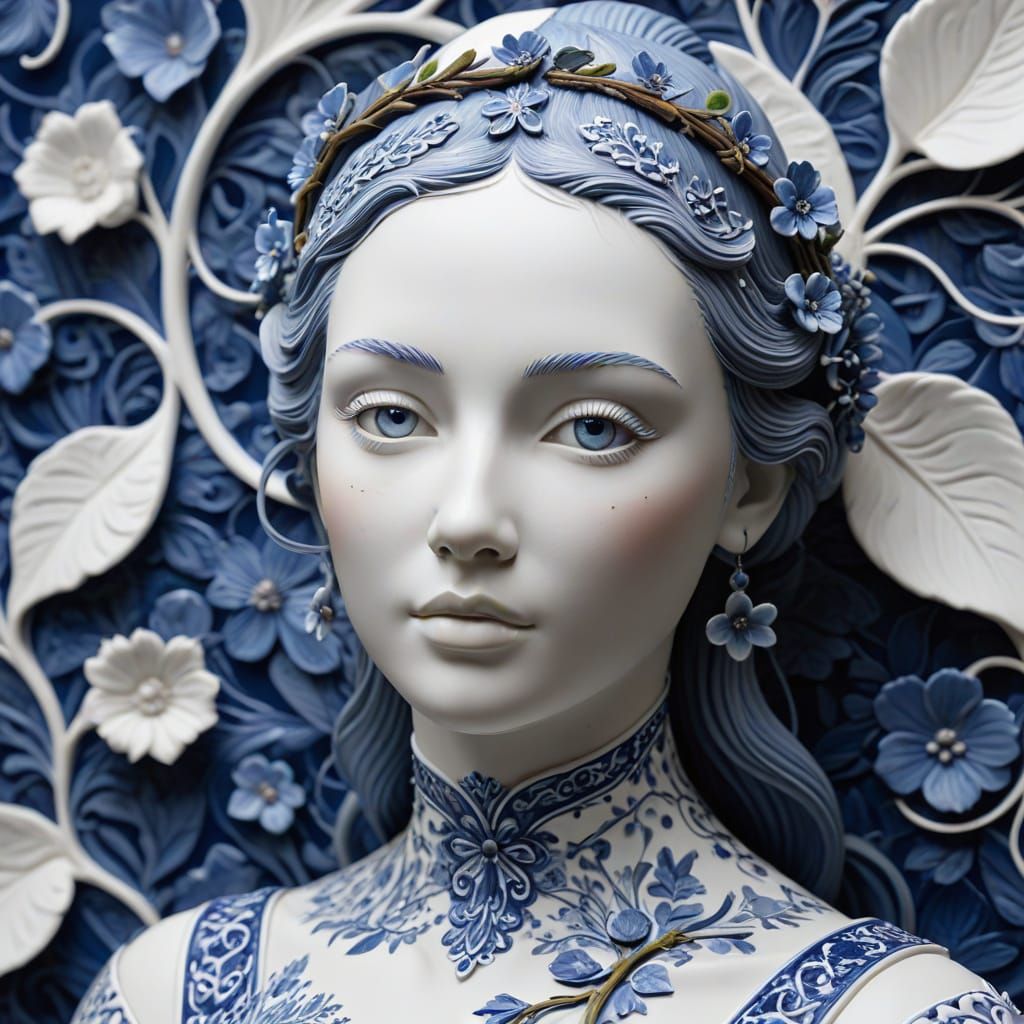 This image shows a stunning close-up of a single porcelain goddess adorned with intricate blue floral and vine patterns, exuding elegance and beauty.