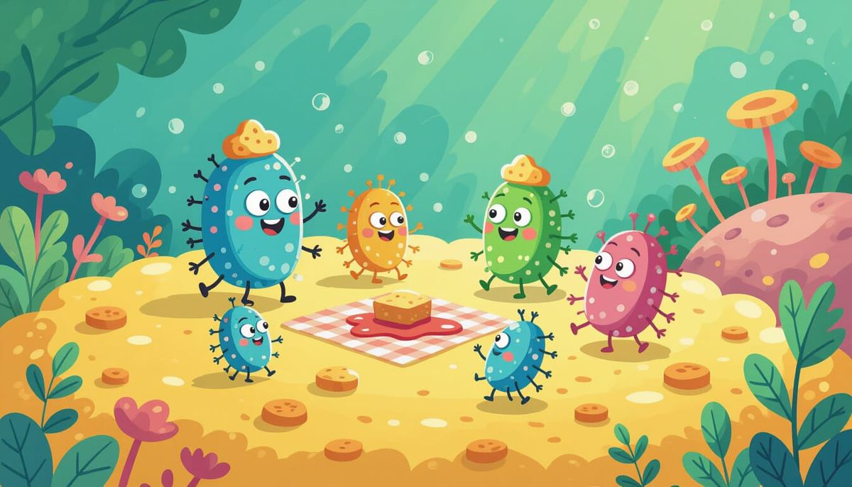 A charming illustration of playful cartoon bacteria having a picnic on a fuzzy mold surface. Features soft shapes, vibrant colors, and a humorous scene inspired by classic children's book art.