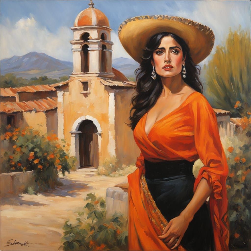 A stunning impressionist portrait of a young woman wearing a black sombrero and vibrant orange shirt, set against the backdrop of a rustic Spanish Mission in a Mexican village.