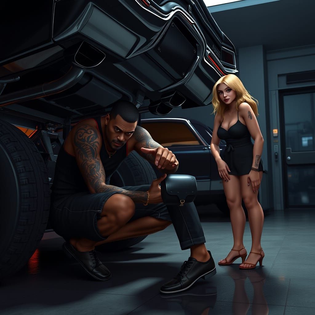 A close-up of a rugged Black man under a sleek, matte-black car, tweaking the exhaust system in a dimly lit garage, as a mysterious woman lurks in the shadows, surrounded by anticipation.