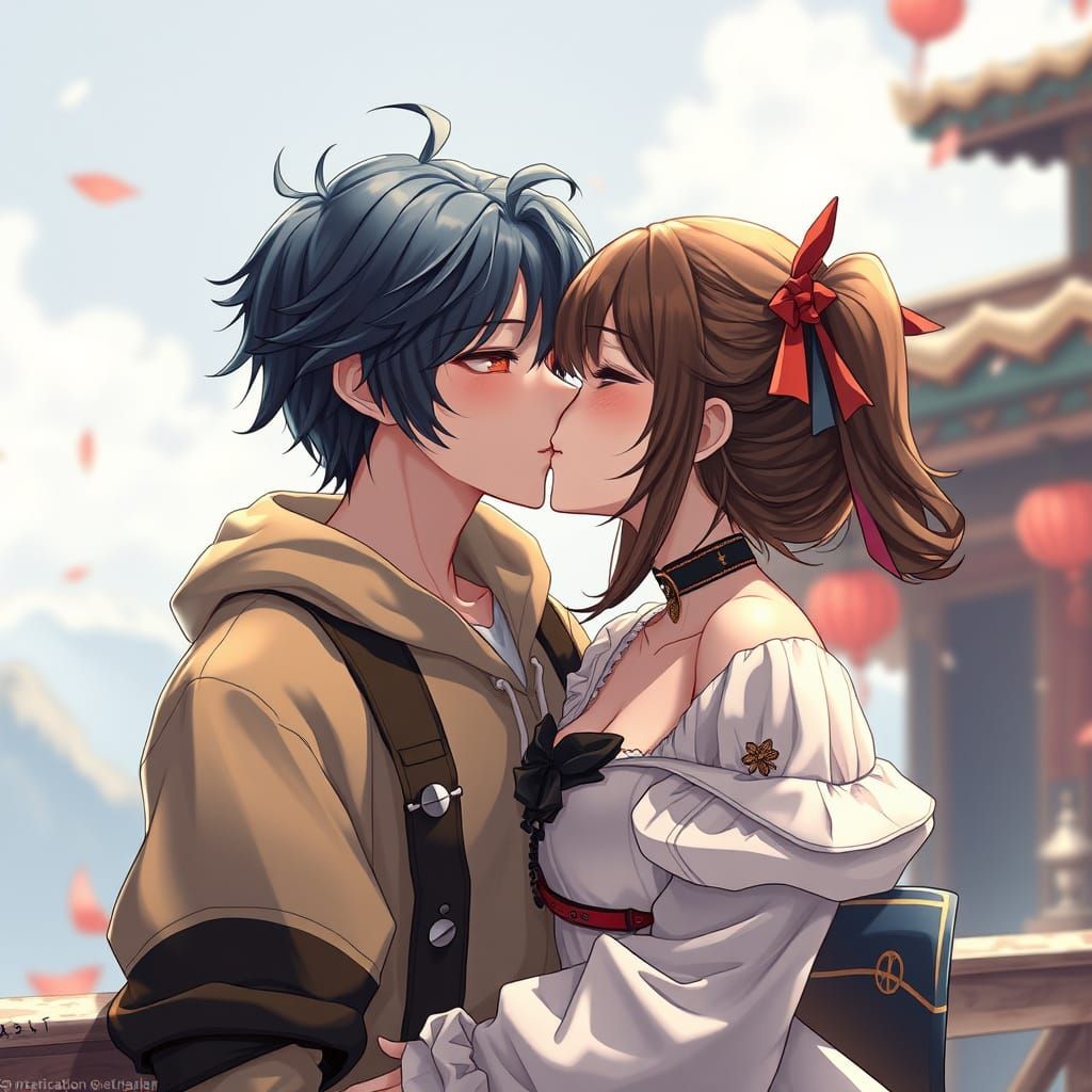 This stunning image captures a tender moment of love between two anime characters, set against a backdrop of intricate 3D detail and vibrant colors, reminiscent of concept art and 8K resolution.