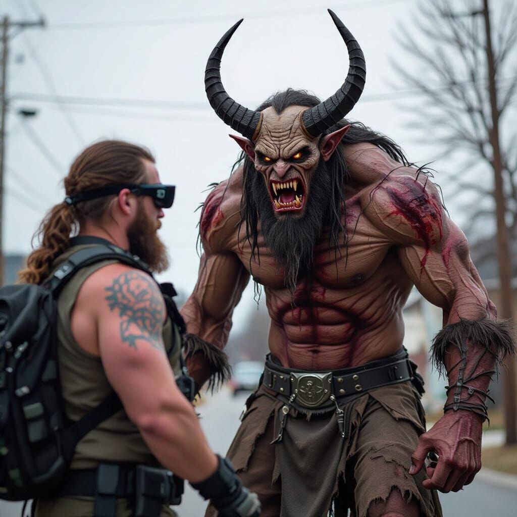 This image depicts a powerful man with long hair, wearing cybernetic glasses, confronting a horned monster. He is preparing to strike the creature with a silver stake amidst a red rain.