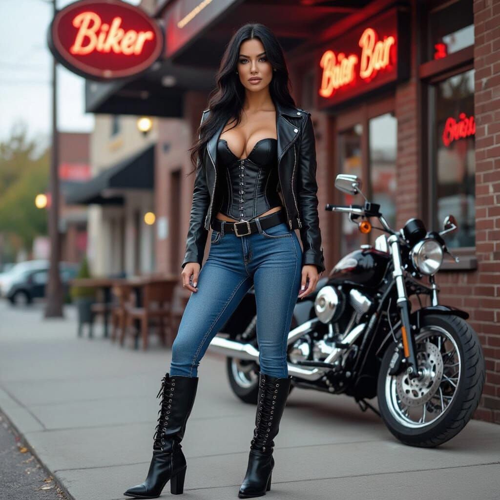 This image features a tall, athletic woman with long black hair, dressed in a leather corset, biker jacket, and heeled boots, standing confidently outside a biker bar.