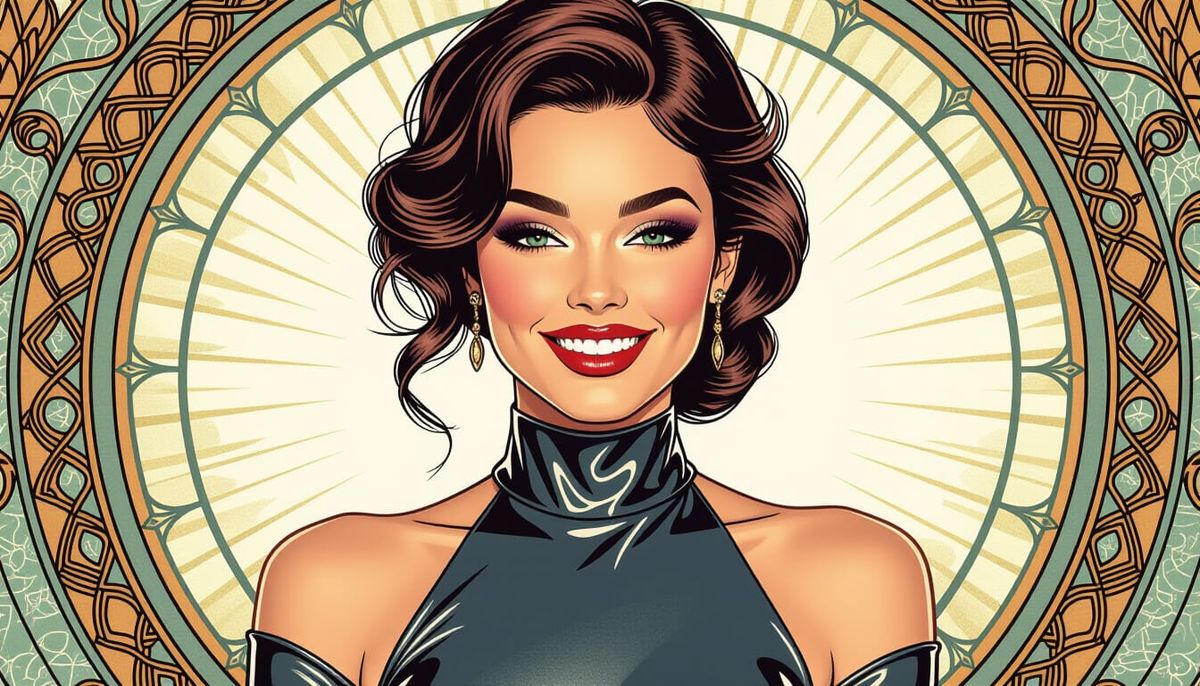 A striking picture of a smiling fashion model in a gunmetal grey latex dress. The image is a stylized line art illustration with sleek, high-contrast designs.