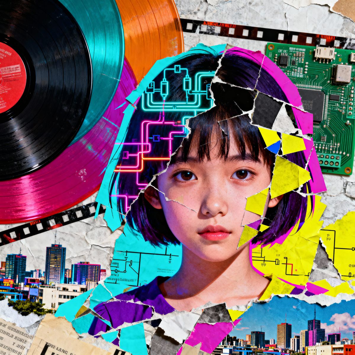 This image features a fragmented portrait of a young girl as a high-contrast analog collage. Vibrant colors and glitch art elements create a punk zine aesthetic with a data-ghost vibe.