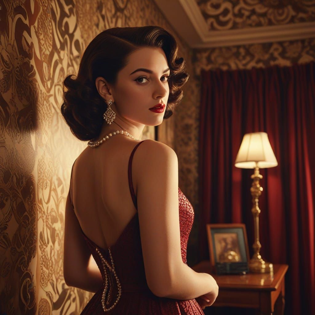 A digital art portrait of a 1950s-style Italian pin-up woman. The close-up shot features glowing pearl jewelry, intricate geometric patterns on her dress, and soft, golden, cinematic lighting.