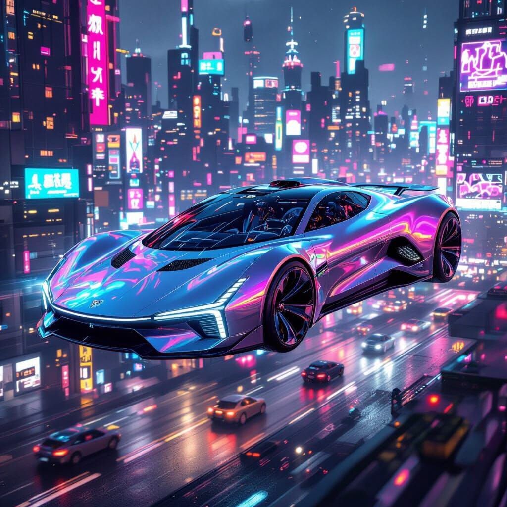 A futuristic car hovers above a neon city at night. The vehicle has a metallic sheen and iridescent coloring. The scene is rendered in a cyberpunk aesthetic.