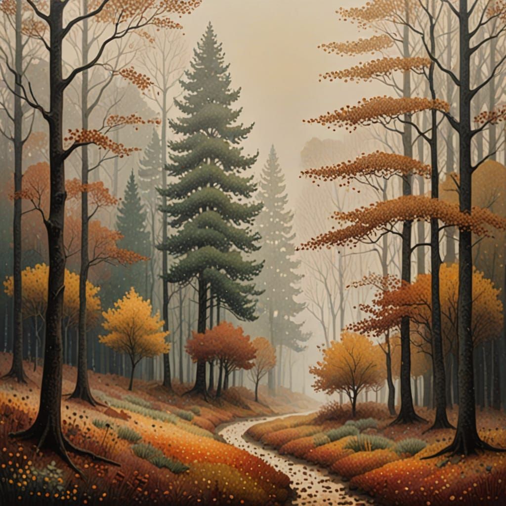 This image depicts a somber, misty forest in autumn, rendered with intricate dots and warm, earthy colors in a style reminiscent of Seurat.