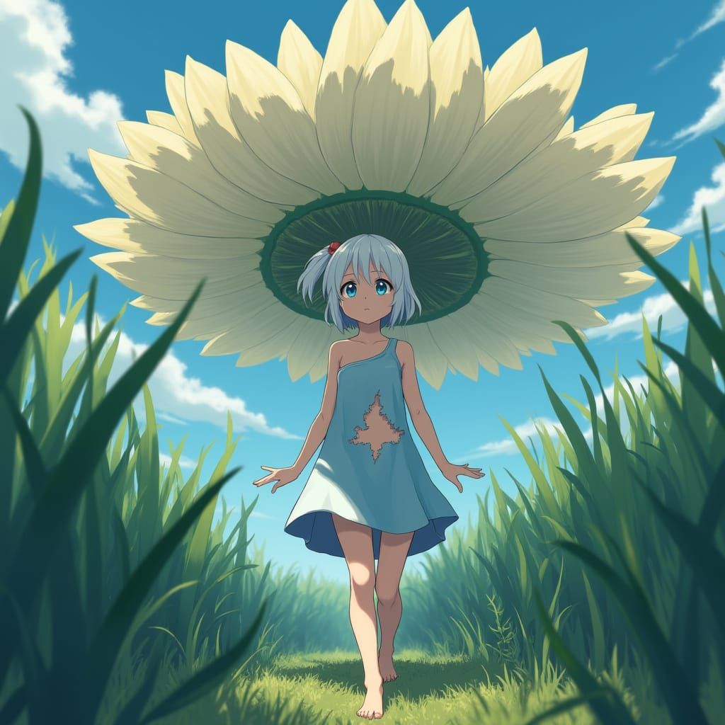 This image depicts a tiny anime girl with short white hair and light blue eyes, peeking out from under a massive flower as she walks through a sea of tall grass. The scene is lit with cinematic flair, reminiscent of Studio Trigger's style, and features a high-quality, detailed aesthetic.