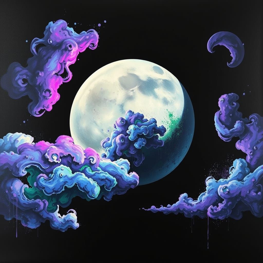 This vibrant, dreamlike image depicts a lunar landscape in the shape of an inverted figure eight, set against a stark black sky. The scene features bold brushstrokes, dynamic textures, and intricate details reminiscent of graffiti and street art, blending traditional and digital media.