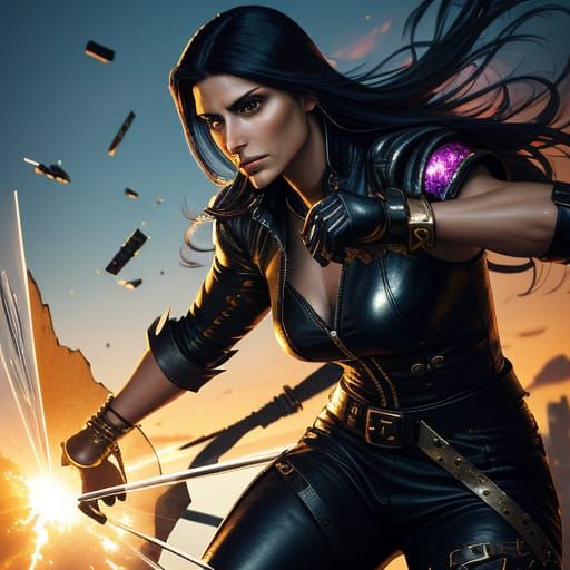 A vibrant digital painting shows a close-up of a character resembling Nelly Furtado dressed as Nina Williams, shattering glass in golden hour lighting. The artwork features dynamic shadows.