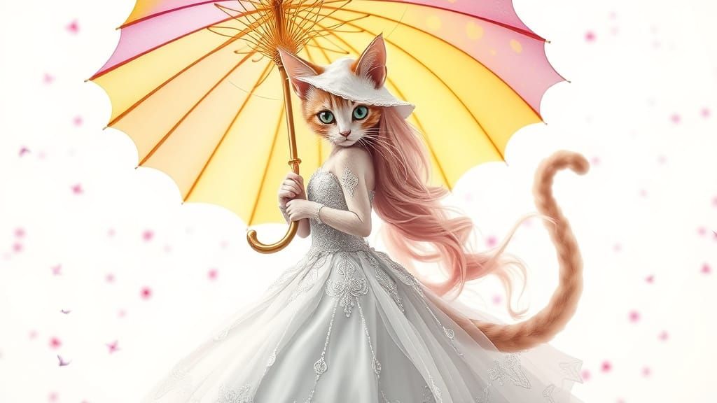A graceful cat bride in a flowing silver dress poses with a vibrant umbrella. The image features delicate feline features, cascading blond hair with pink hues, and a soft background with flowers, in a heavenly, hyper-detailed style.