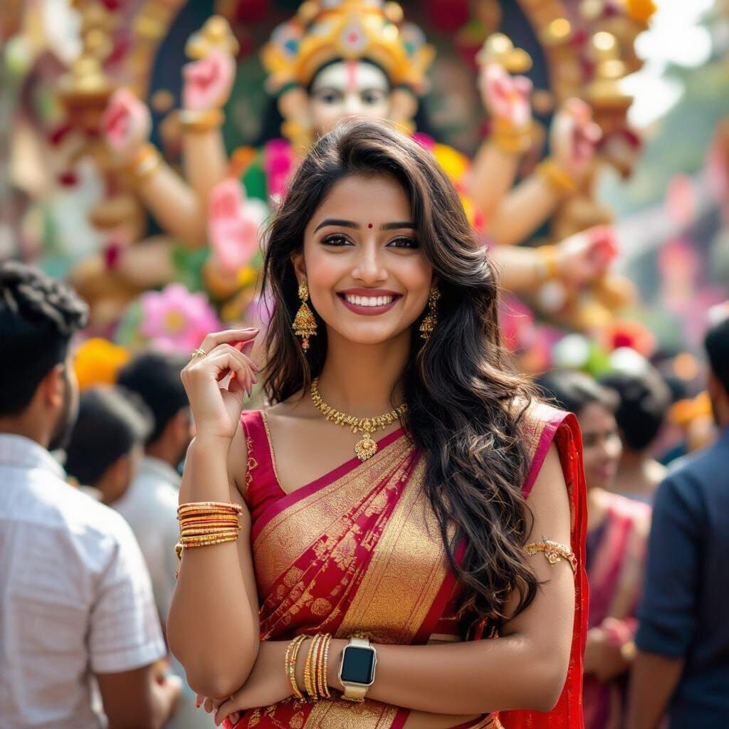 This image shows a smiling Bengali woman in a vibrant Durgapuja celebration. She wears a traditional saree and bangles, with a Durga idol and lively crowd in the background, rendered with realistic textures.