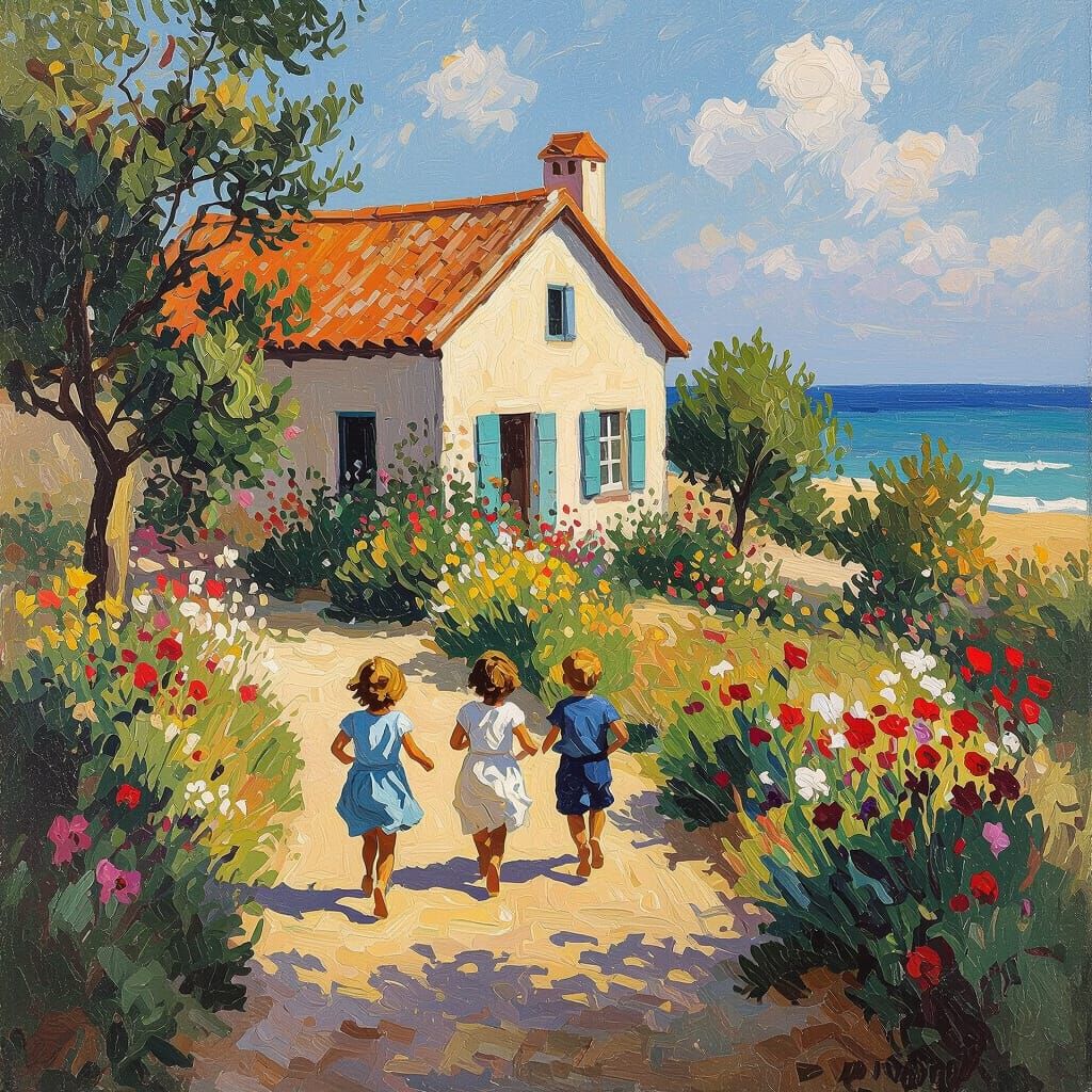 This image shows children playing near a beautiful house with colorful flower gardens, situated on a serene beach. The art style evokes impressionist paintings with vibrant colors and textured brushstrokes.