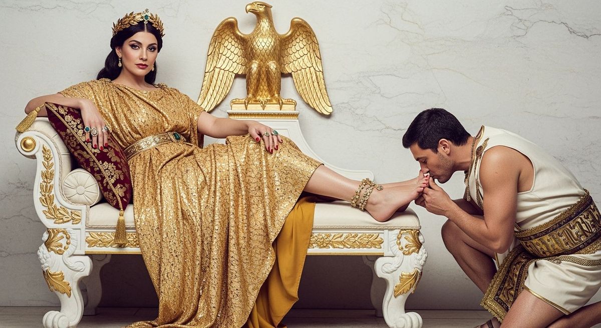 This image shows a Roman Empress in a golden toga reclining on a marble chaise lounge. The photograph features shallow depth of field, natural lighting and evokes classical portraiture.